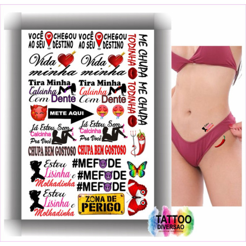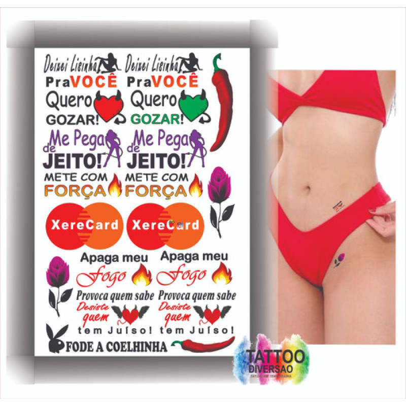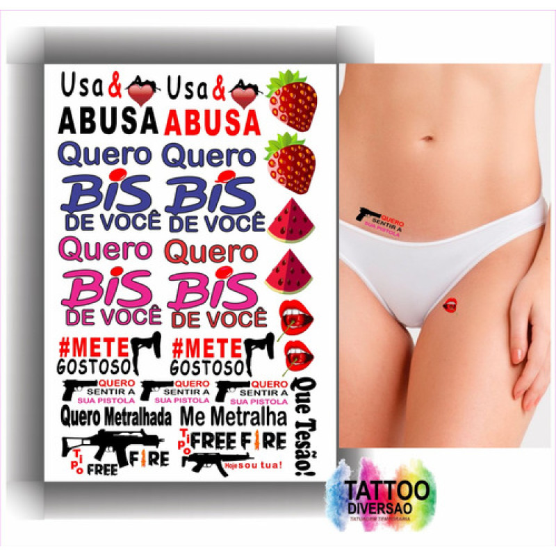 - Kits composto por 4 cartelas de tatuagens temporárias que contém 115 artes de frases e desenhos picantes.