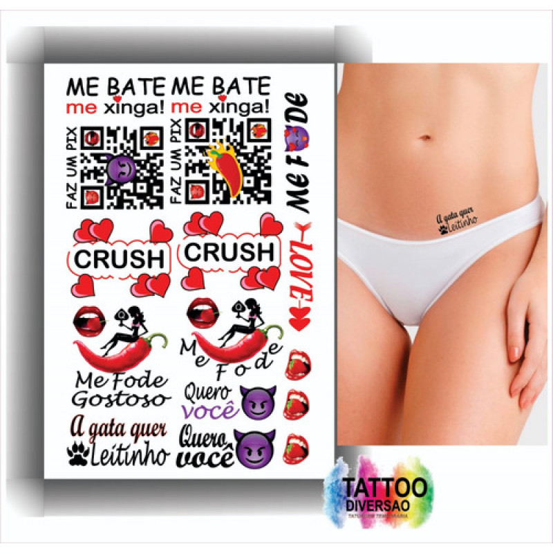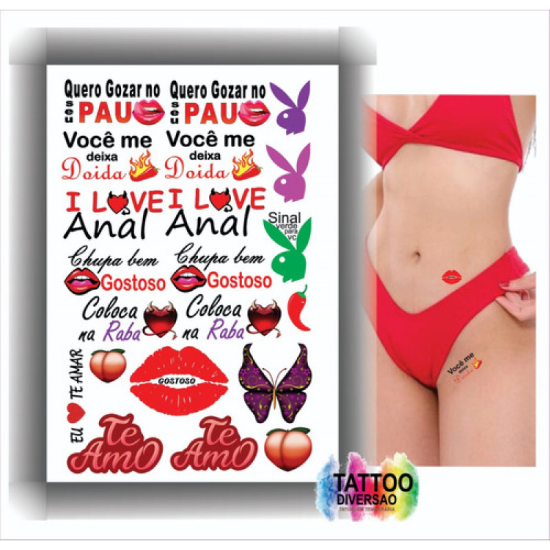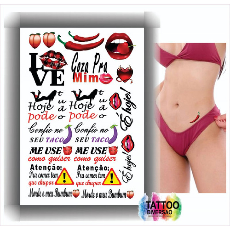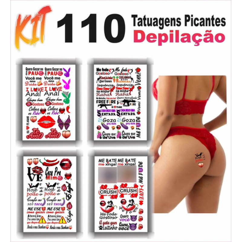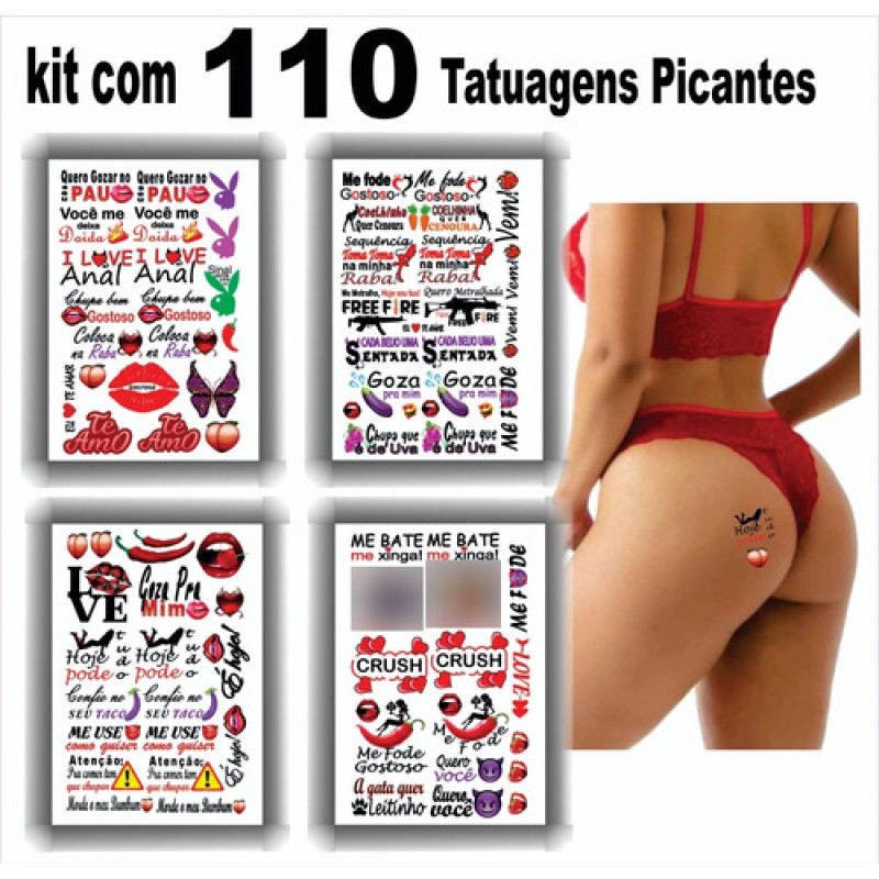 - Kits composto por 4 cartelas de tatuagens temporárias que contém 110 artes de frases e desenhos picantes.
